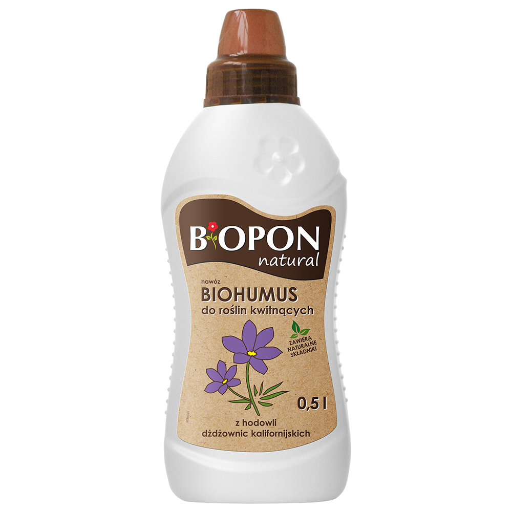 Pojemność 0,5L Zalety produktu:- Wieloskładnikowy, płynny nawóz organiczno - mineralny, pozyskiwany z produktu dżdżownic kalifornijskich, przeznaczony do regularnego zasilania roślin ozdobnych uprawianych w pojemnikach