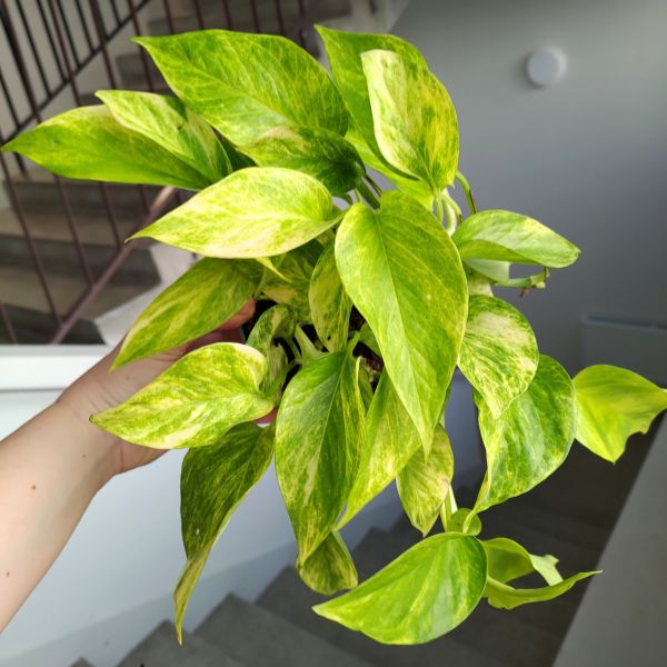 Epipremnum aureum 'Neon Queen’ to ekscytująca nowość wśród odmian scindapsusa złocistego, powstała jako hybryd dwóch popularnych odmian – 'Neon’ i 'Marble Queen’, łącząc w sobie najlepsze cechy obojga rodziców. Ta roślina zachwyca oszałamiającą, jaskrawozieloną kolorystyką z głębokimi, intensywnymi złotymi żyłkami przypominającymi błyskawice , tworząc spektakularny, marmurkowo-neonowy wzór na każdym liściu. Charakteryzuje się bujnym, ciemnozielonym ulistnieniem ozdobiony uderzającą chartreuse’ową, marmurową pstrokacizną na długich, zwisających pędach , które tworzą efektowną kaskadę idealną do wiszących doniczek lub jako roślina wspinająca się. Jeśli hodowana jako wisząca pnączka, liście pozostaną w młodszej formie, natomiast gdy zapewnimy jej podporę do wspinania, wytworzy dojrzałe, fenestratowane liście , które z każdym kolejnym poziomem będą coraz większe.