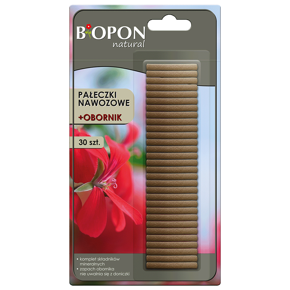 Pałeczki nawozowe przeznaczone do pielęgnacji wszystkich roślin doniczkowych i balkonowych. Dostarczają niezbędne składniki mineralne oraz materię organiczną i odżywiają roślinę aż do 100 dni. Dzięki zawartości obornika doskonale użyźniają i spulchniają glebę. Nawóz pobudza rozwój mikroflory glebowej. Szybko wchłania się w podłoże i jest łatwo przyswajalny dla roślin. Pałeczki stopniowo ulegają rozpuszczeniu dostarczając roślinom pokarm regularnie i długotrwale. Do stosowania przez cały rok.